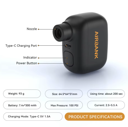 Mini Rechargeable Bike Pump – 100PSI, Schrader/Presta Compatible, Type C, AS100