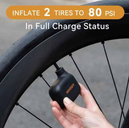 The AS100 Mini Rechargeable Bike Pump delivers up to 100PSI pressure and supports both Schrader and Presta valves.