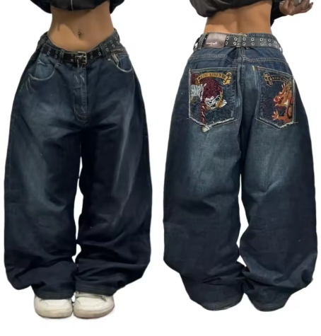 The 2024 Retro Hip Hop Embroidered Jeans bring a gothic streetwear edge with a wide-leg unisex fit.